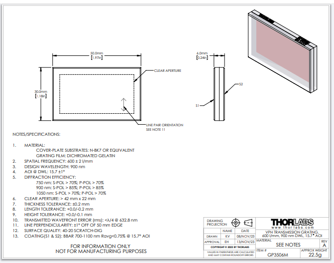 Thorlabs索雷博 GP3506M - 体相位全息透射光栅