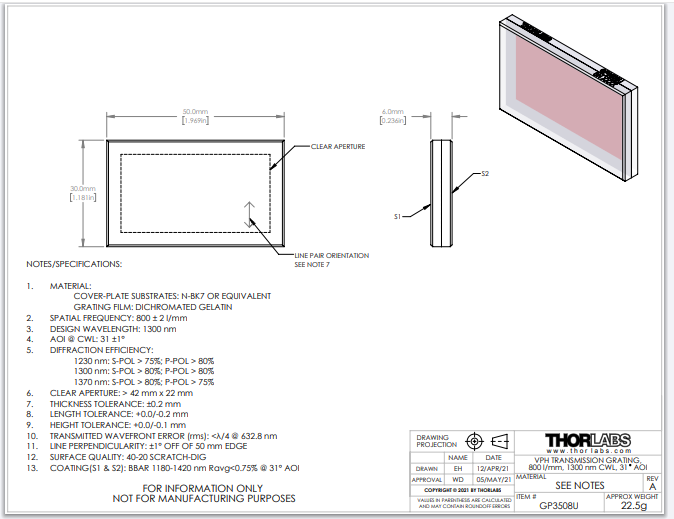 Thorlabs索雷博     GP3508U - 体相位全息透射光栅