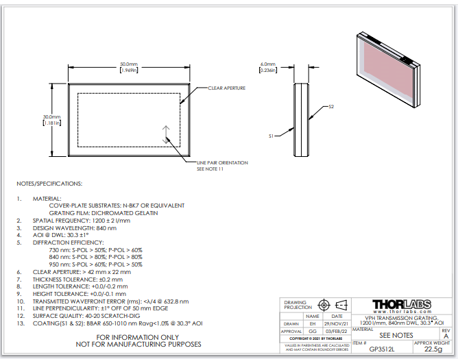 Thorlabs索雷博     GP3512L - 体相位全息透射光栅