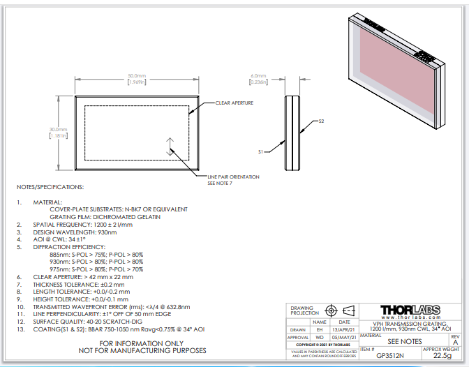 Thorlabs索雷博 GP3512N - 体相位全息透射光栅