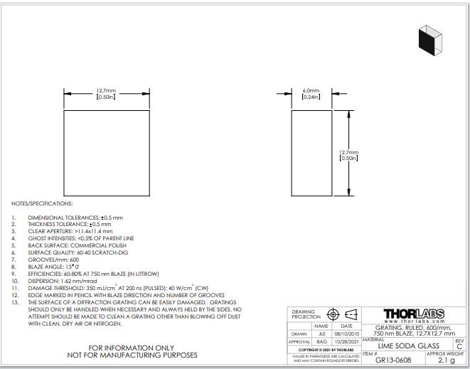 Thorlabs索雷博     GR13-0608 - 刻划衍射光栅