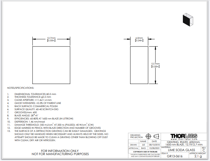 Thorlabs索雷博 GR13-0616 - 刻划衍射光栅