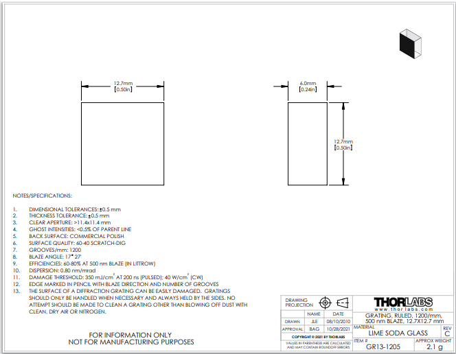 Thorlabs索雷博 GR13-1205 - 刻划衍射光栅