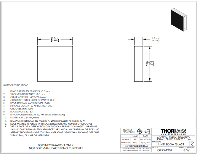 Thorlabs索雷博 GR25-1204 - 刻划衍射光栅