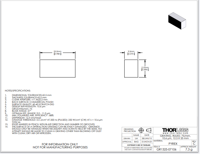 Thorlabs索雷博 GR1325-07106 - 反射式刻线衍射光栅