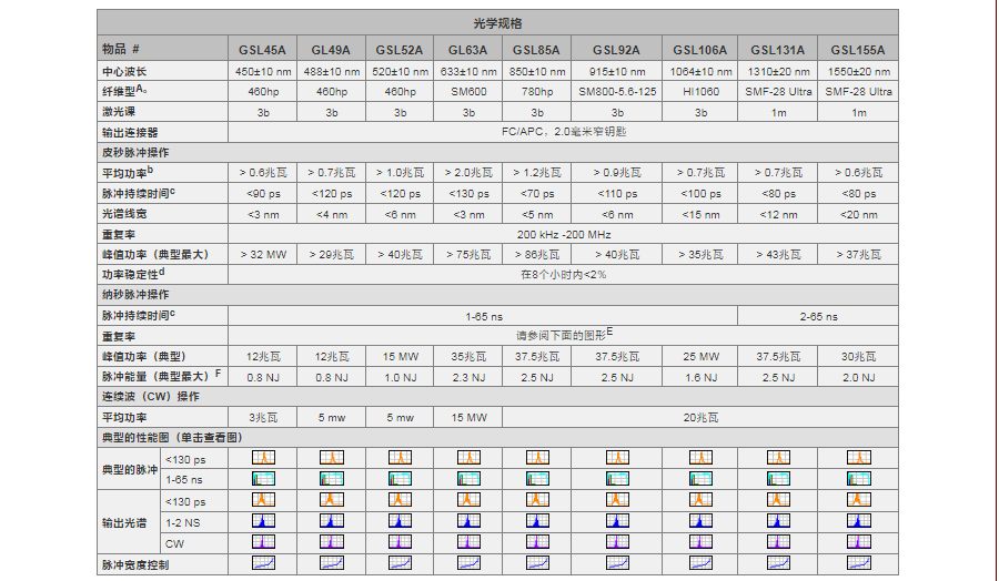 脉宽提供固定宽度或可在15种离散设置中进行调节(从最小指定宽度到最大指定宽度)。典型脉冲图请查看上方Typical Pulses行,每个脉宽设置的可选脉宽和可选重频范围请查看右图。