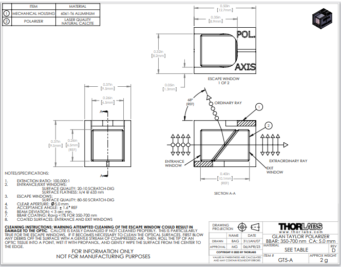 Thorlabs索雷博     GT5-A - 格兰-泰勒偏振器