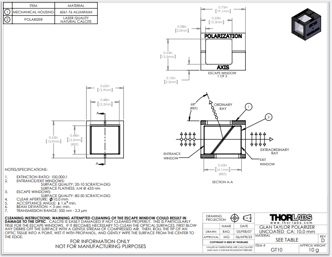 Thorlabs索雷博     GT10 - 格兰-泰勒偏振器