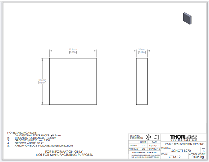 Thorlabs索雷博     GT13-12 - 可见光透射光栅