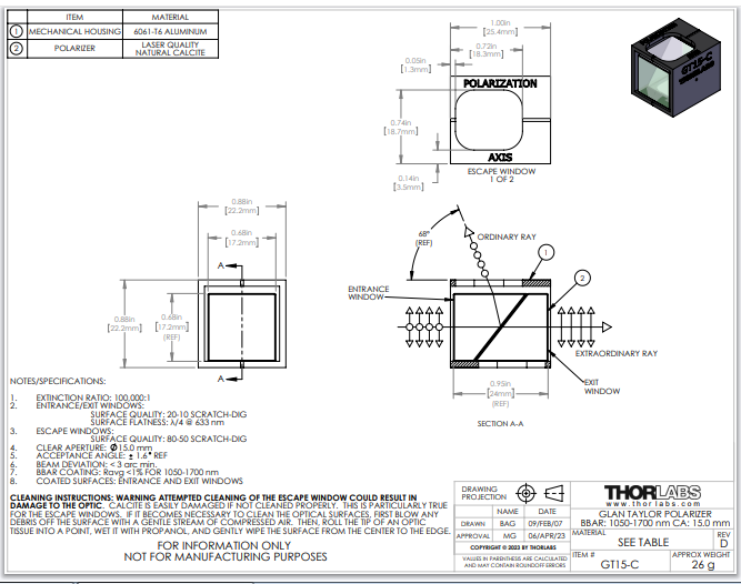 Thorlabs索雷博 GT15-C - 格兰-泰勒偏振器