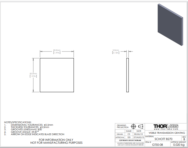 Thorlabs索雷博 GT50-08 - 可见光透射光栅