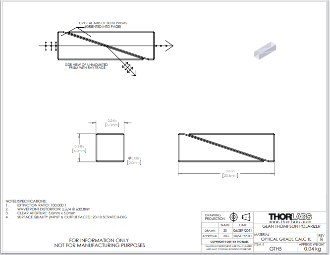 Thorlabs索雷博 GTH5 - 格兰汤普森方解石偏振镜