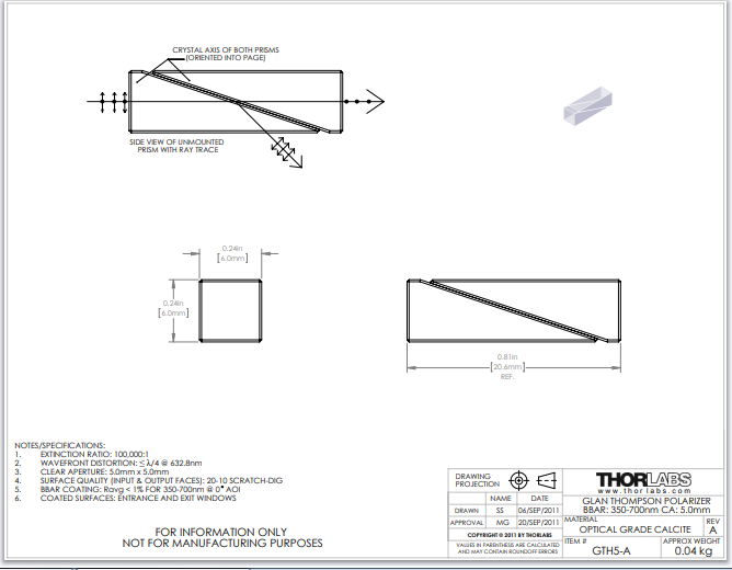 Thorlabs索雷博 GTH5-A - 格兰汤普森方解石偏振镜