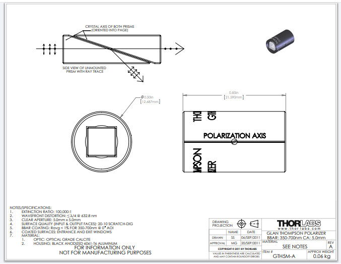 Thorlabs索雷博 GTH5M-A - 已装配格兰-汤普森方解石偏振器