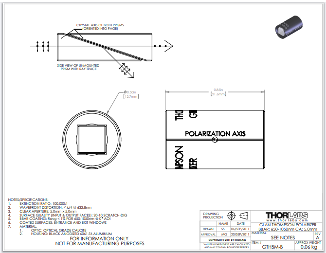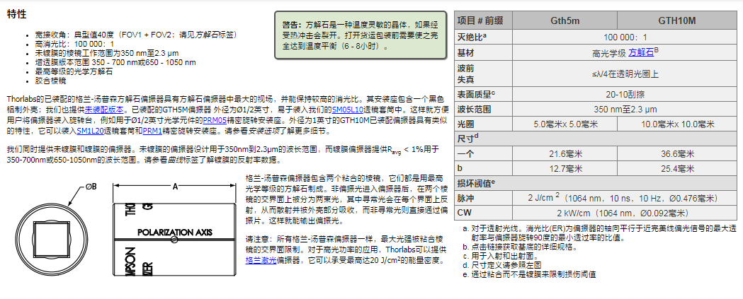 Thorlabs索雷博 GTH5M-B - 已装配格兰-汤普森方解石偏振器