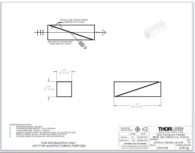Thorlabs索雷博 GTH10-B - 格兰汤普森方解石偏振镜