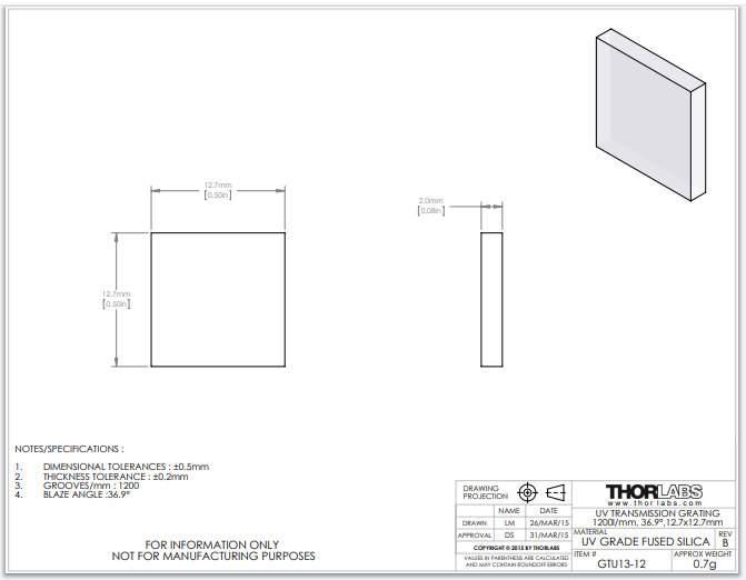Thorlabs索雷博     GTU13-12 - 紫外透射光栅