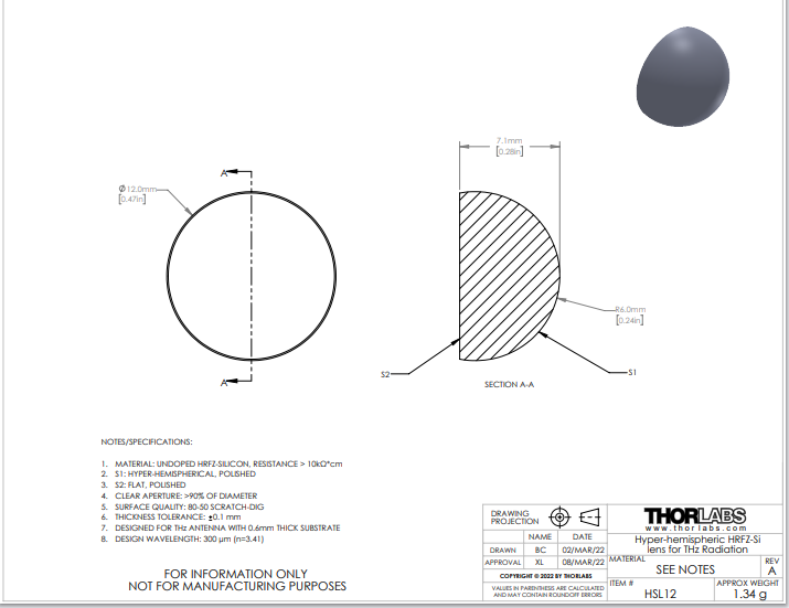 Thorlabs索雷博 HSL12 - 超半球形HRFZ-Si透镜