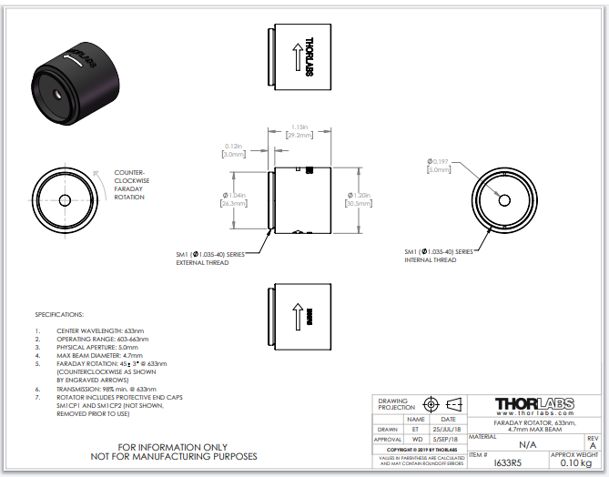 Thorlabs索雷博 I633R5 - 45°法拉第旋光器