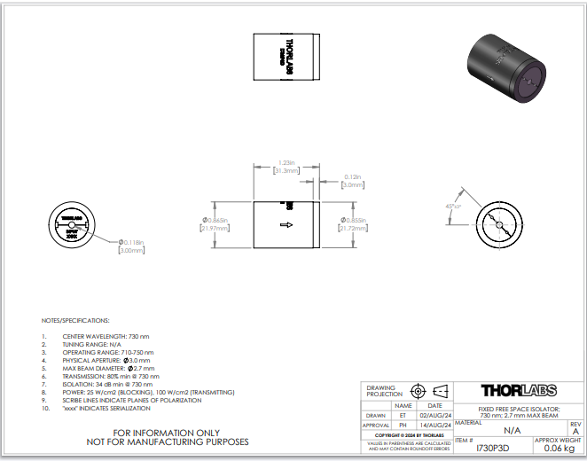 Thorlabs索雷博     I730P3D - 自由空间隔离器