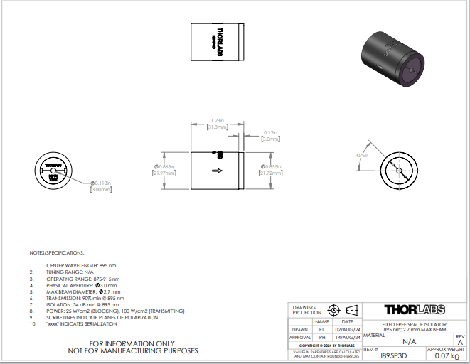 Thorlabs索雷博 I895P3D - 自由空间隔离器