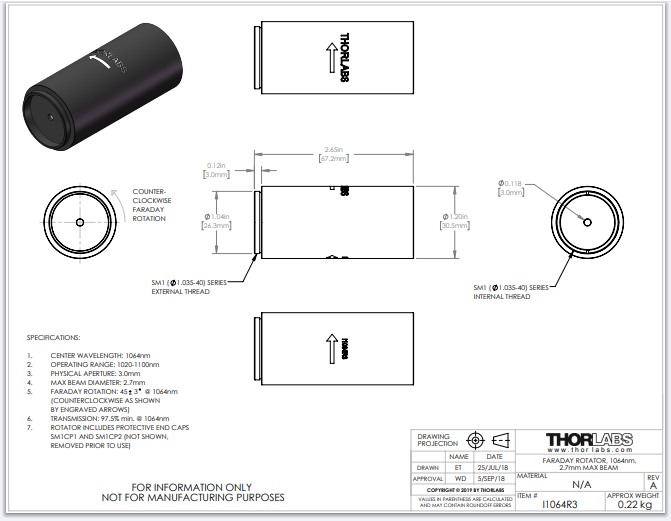Thorlabs索雷博 I1064R3 - 45°法拉第旋光器