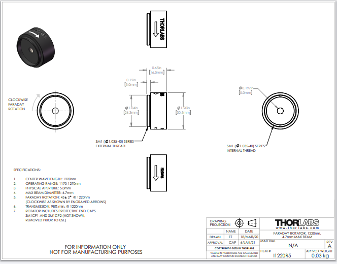 Thorlabs索雷博 I1220R5 - 45°法拉第旋光器