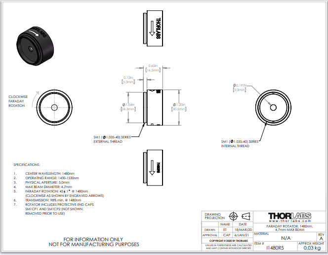 Thorlabs索雷博 I1480R5 - 45°法拉第旋光器