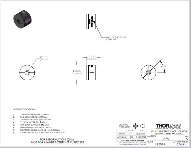 Thorlabs索雷博 I1850P4 - 自由空间隔离器