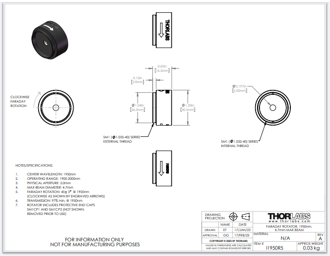 Thorlabs索雷博 I1950R5 - 45°法拉第旋光器
