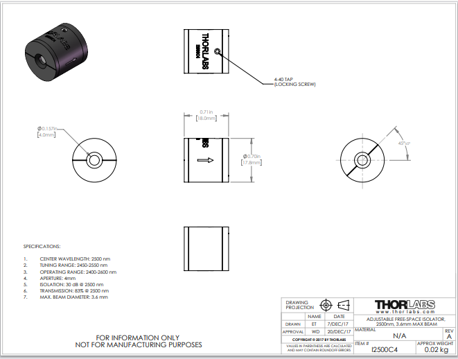 Thorlabs索雷博 I2500C4 - 自由空间隔离器