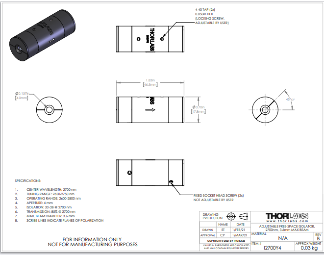 Thorlabs索雷博     I2700Y4 - 自由空间隔离器