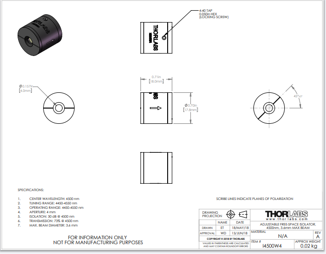 Thorlabs索雷博     I4500W4 - 自由空间隔离器