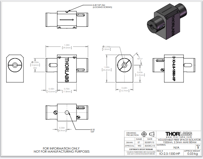 Thorlabs索雷博 IO-2.5-1550-HP - 自由空间隔离器