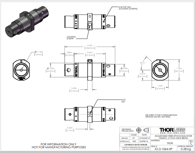 Thorlabs索雷博 IO-3-1064-HP - 自由空间隔离器