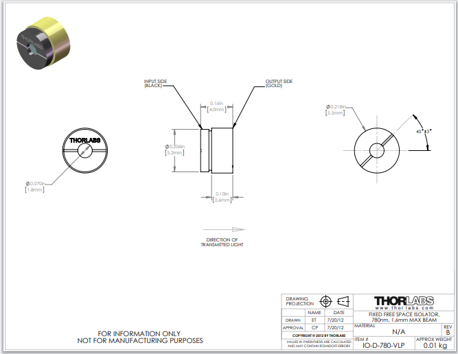Thorlabs索雷博 IO-D-780-VLP - 自由空间隔离器