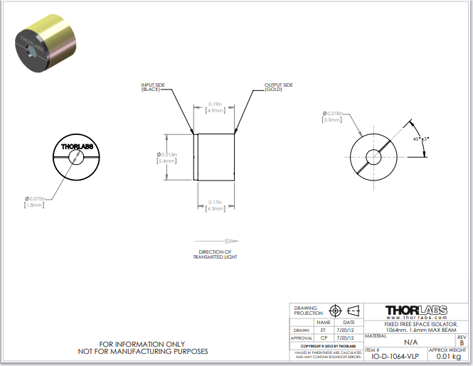 Thorlabs索雷博 IO-D-1064-VLP - 自由空间隔离器