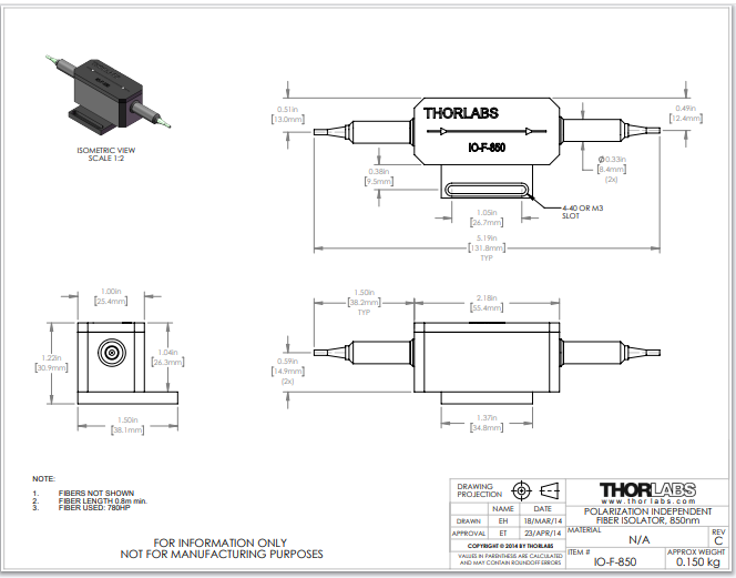 Thorlabs索雷博     IO-F-850 - 光纤隔离器