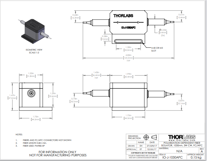 Thorlabs索雷博 IO-J-1030APC - 光纤隔离器