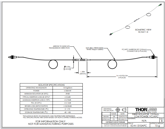 Thorlabs索雷博 IO-H-1310APC - 光纤隔离器