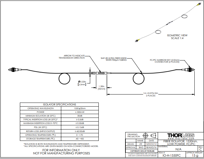 Thorlabs索雷博 IO-H-1550FC - 光纤隔离器