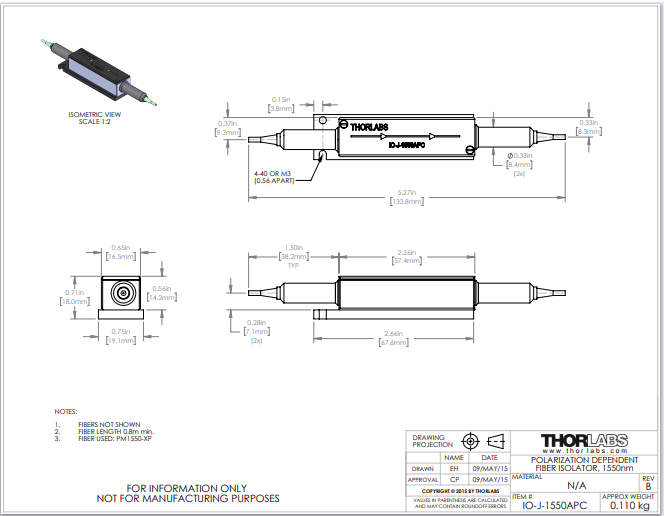 Thorlabs索雷博 IO-J-1550APC - 光纤隔离器