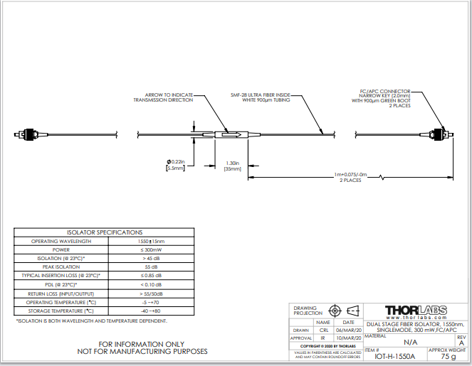 Thorlabs索雷博     IOT-H-1550A - 双级光纤隔离器