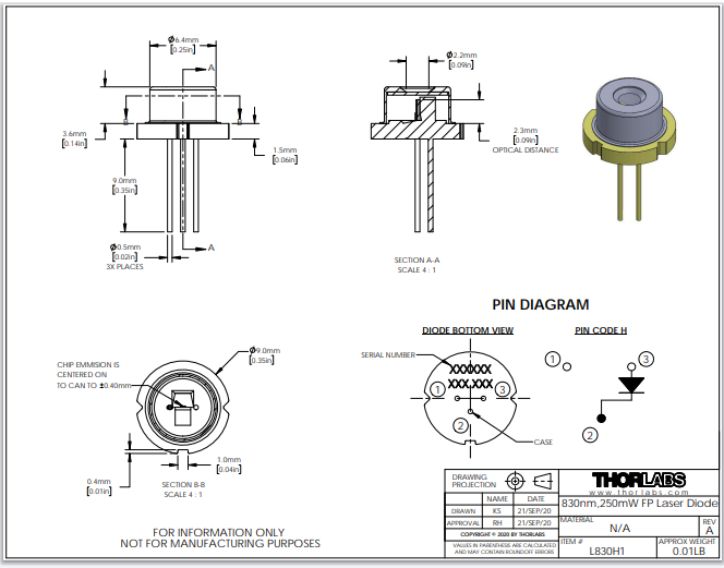 Thorlabs索雷博     L830H1 - 激光二极管