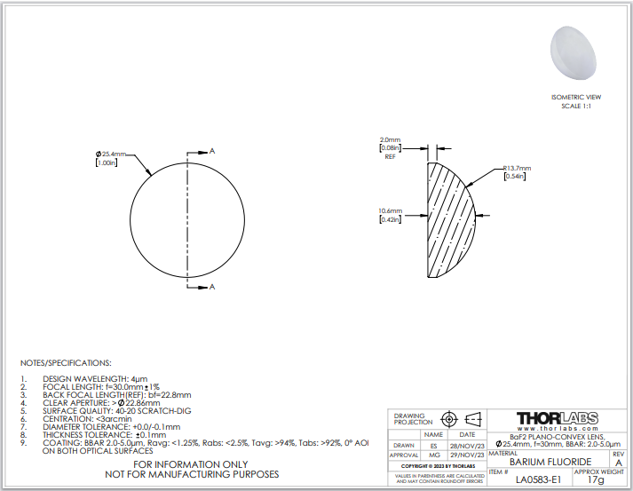 Thorlabs索雷博     LA0583-E1   平凸透镜