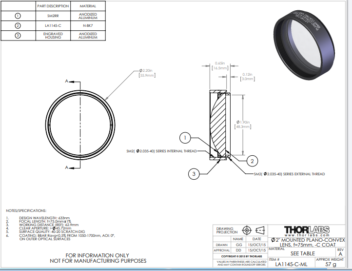 Thorlabs索雷博 LA1145-C-ML 平凸透镜