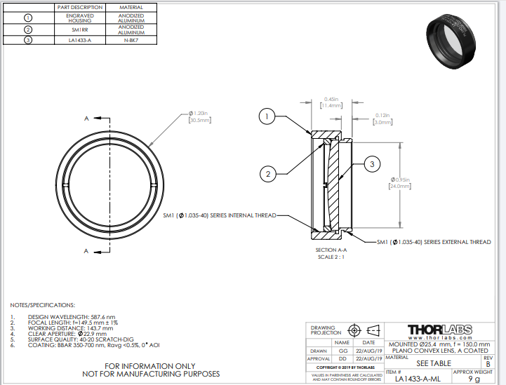 Thorlabs索雷博 LA1433-A-ML 平凸透镜