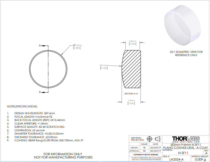 Thorlabs索雷博 LA2024-A 平凸透镜