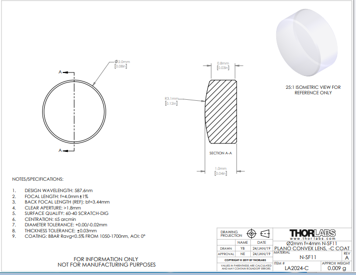 Thorlabs索雷博 LA2024-C 平凸透镜
