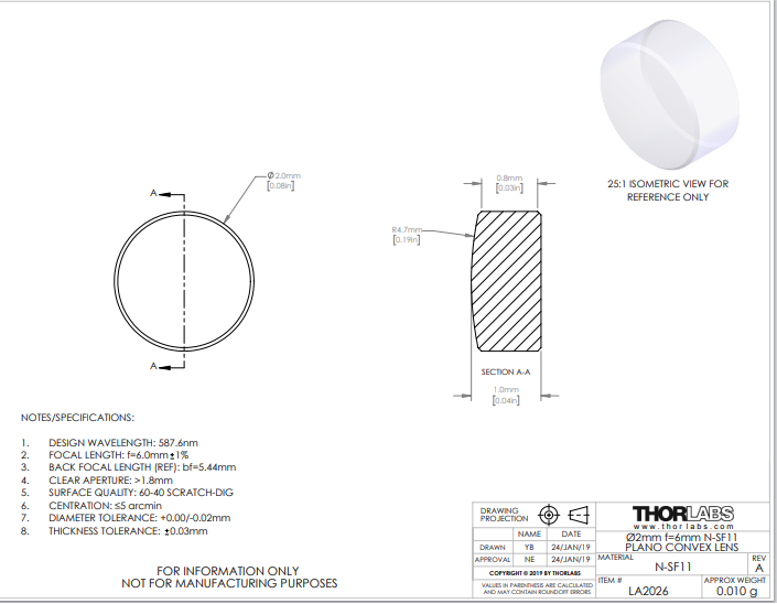 Thorlabs索雷博 LA2026 平凸透镜